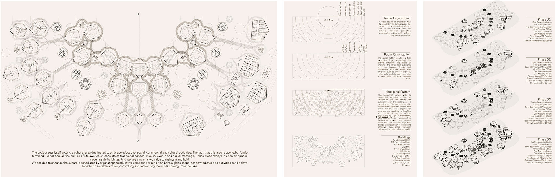 El proyecto se articula en torno a un espacio cultural destinado a acoger actividades educativas, sociales, comerciales y culturales. El hecho de que esta área esté abierta o "indeterminada" no es casual, la cultura de Malawi, que consiste en bailes tradicionales, eventos musicales y reuniones sociales, tiene lugar siempre en espacios al aire libre, nunca dentro de edificios.