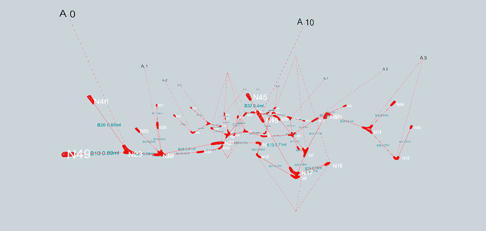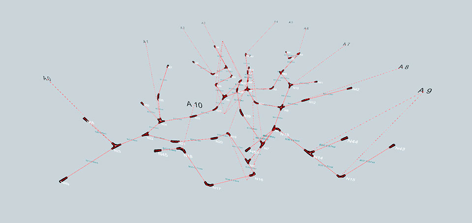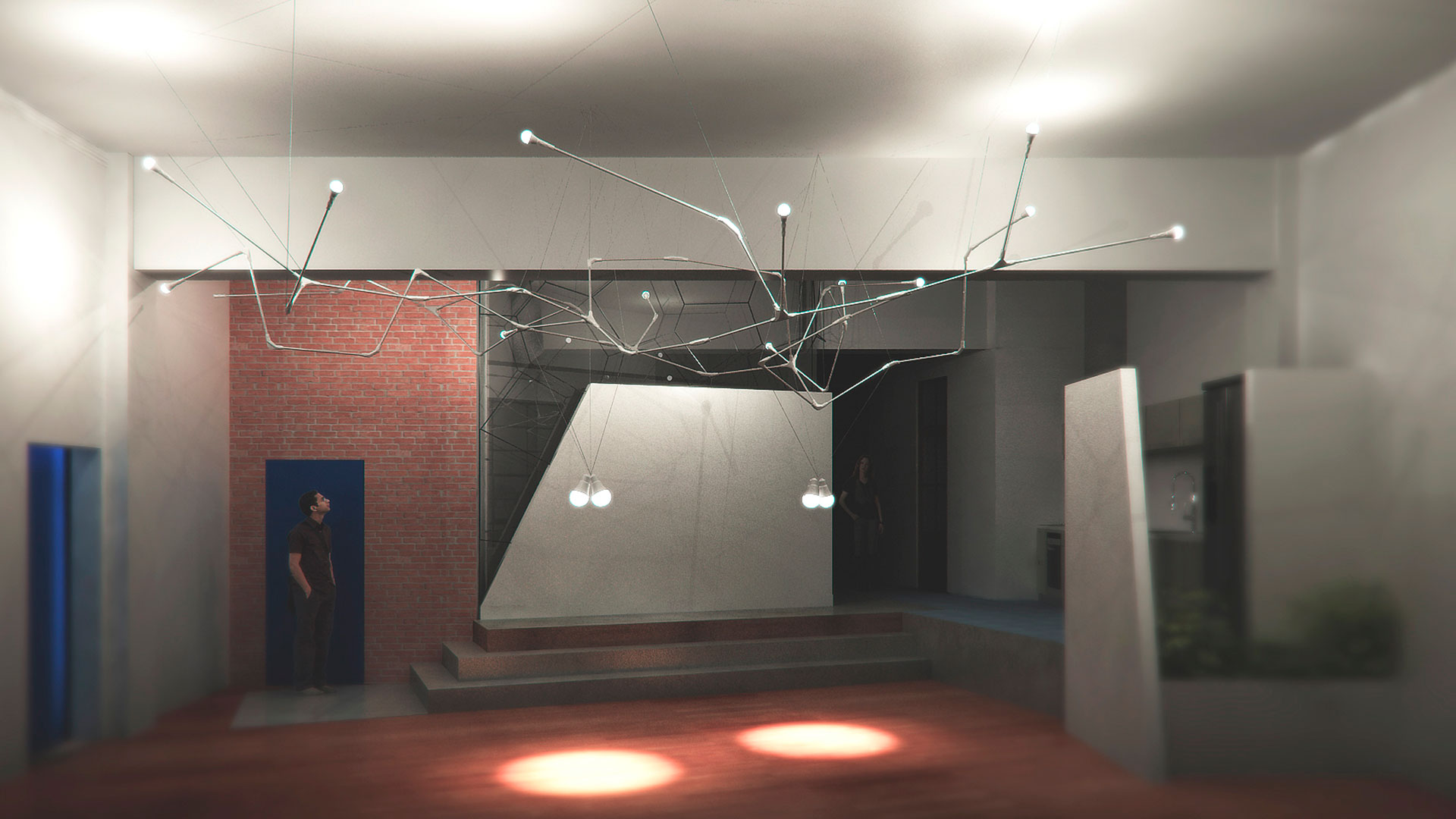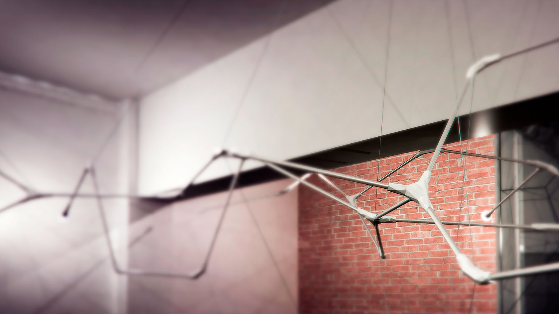Lampara integrada por nodos de PVC con lineas de caño de aluminio y tensores de acero con bombillas led en sus extremos.