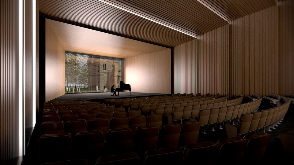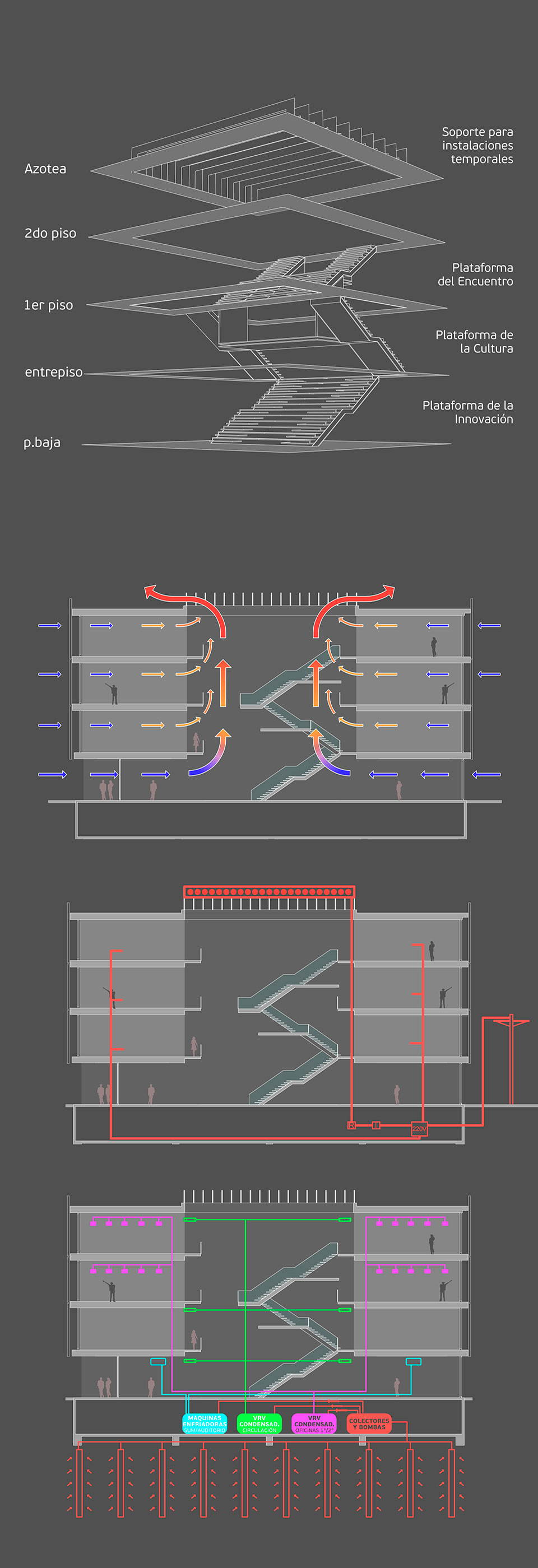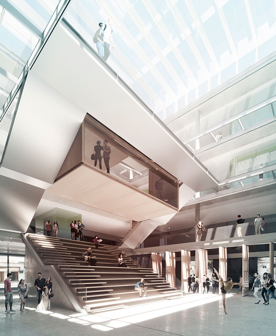 En torno al gran vacío central se organizan las plantas principales del proyecto. Donde dos plantas inferiores contienen el programa artístico y ciudadano, mientras que dos plantas superiores concentran el programa administrativo correspondiente al ministerio.