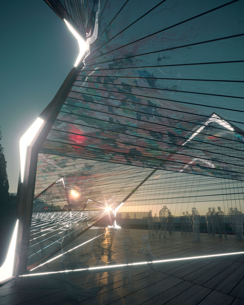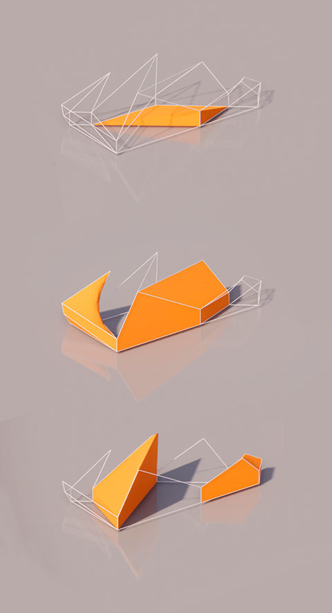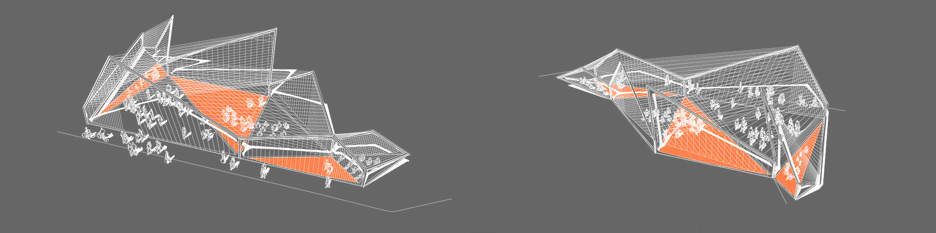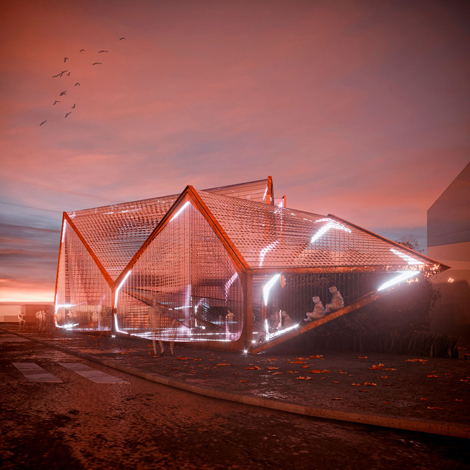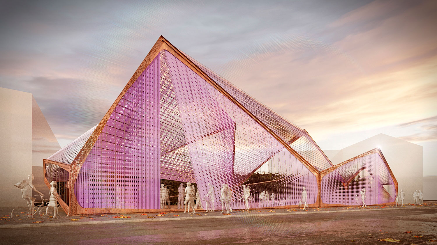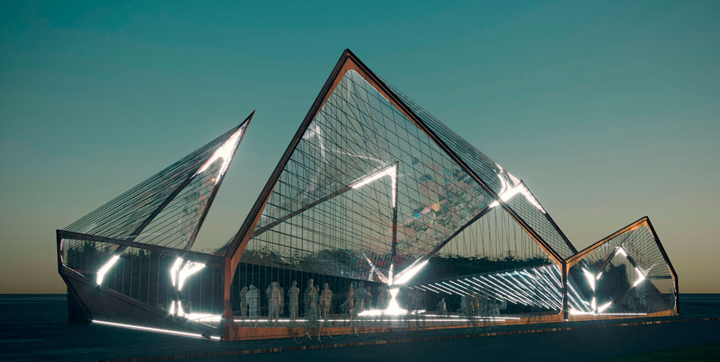 La morfología del pabellón es un simple gesto de desplegar el contorno de la trama, reinterpretando la icónica arquitectura del almacén con distintos perfiles triangulares.