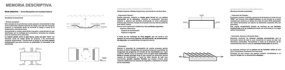En el marco de la convocatoria al Concurso Nacional de Anteproyectos para la “Refuncionalización, Restauración y Puesta en Valor de uno de los Galpones del Ferrocarril General San Martín (FCGSM)” para transformarlo en un “Centro Metropolitano de Industrias Creativas”, un proyecto abierto a la comunidad conformado principalmente por Talleres que responden a políticas de innovación y creatividad tales como: Espacio Maker; Talleres con cortadoras CNC y láser; Salas de Producción Digital e Impresión 3D; Salas Multiespacio; Oficinas de Coworking entre otros programas complementarios.