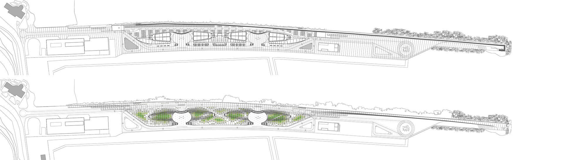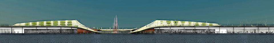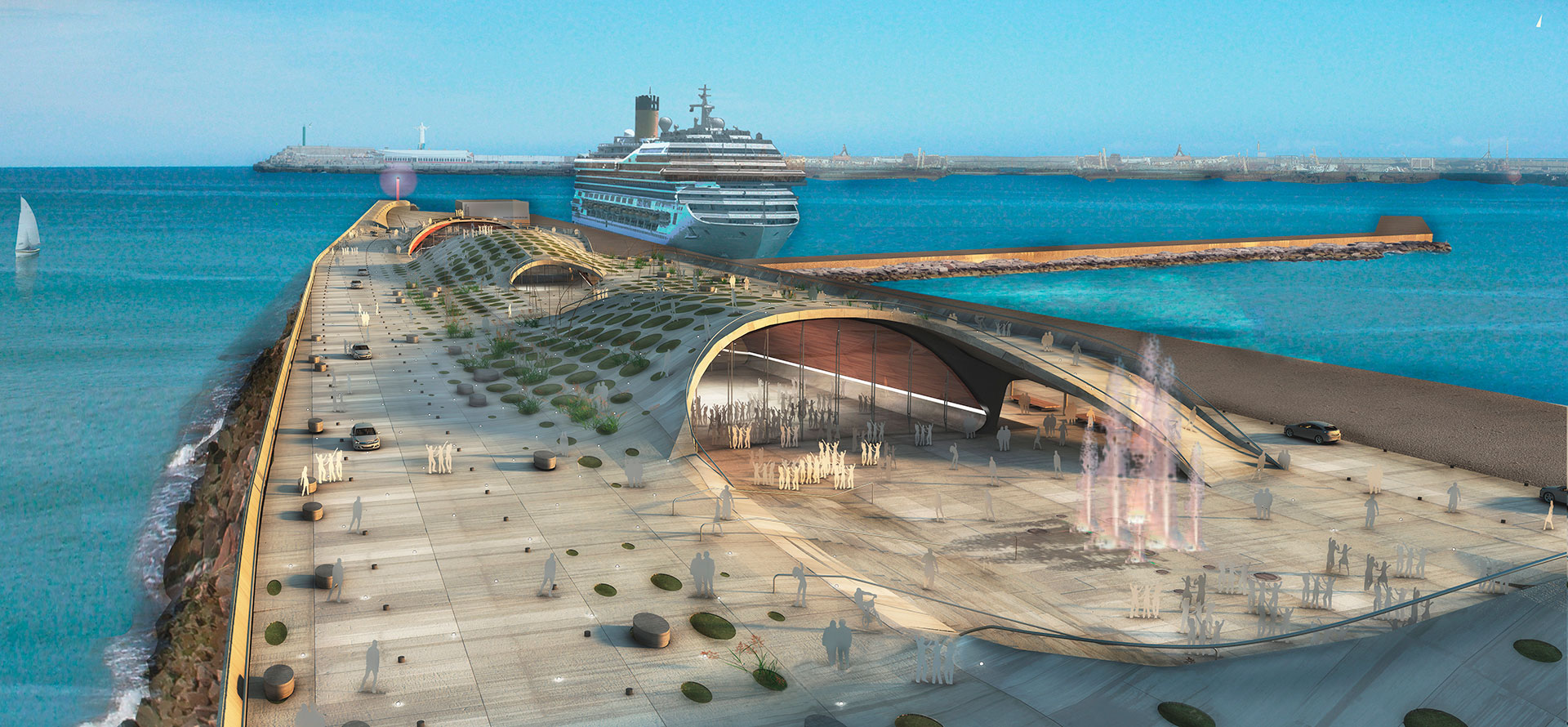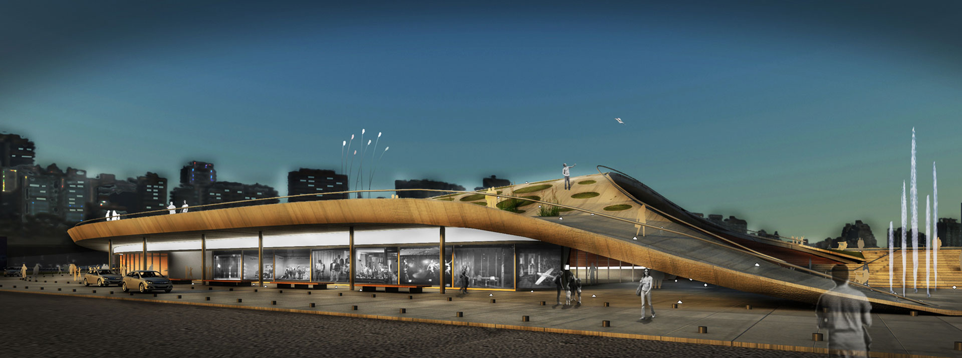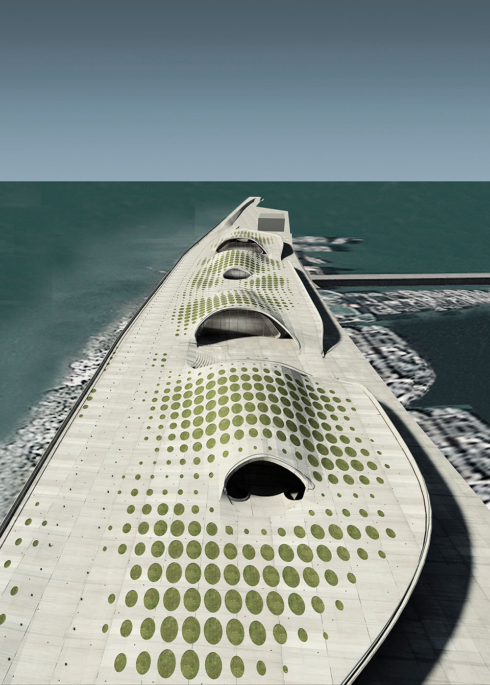 Un gran piso público y una gran cubierta privada, o simplemente un plano en el paisaje, una inmensa manta que se extiende y propone un paseo de encuentros entre el arriba y el abajo. El programa privado discurre por debajo de la manta sosteniendo por encima el programa público que se constituye en el gran parque marítimo de la ciudad. La arquitectura como herramienta social.