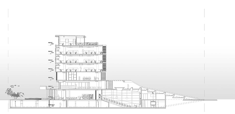 Concebido desde el punto de vista material como un contraste entre las áreas comunes de los pisos inferiores y, las áreas de enseñanza en los pisos superiores reforzando la identidad del edificio.