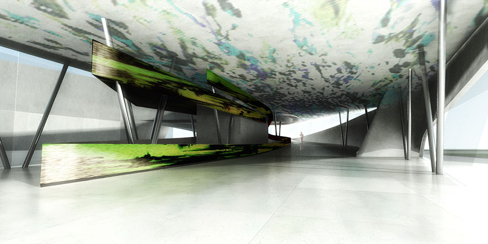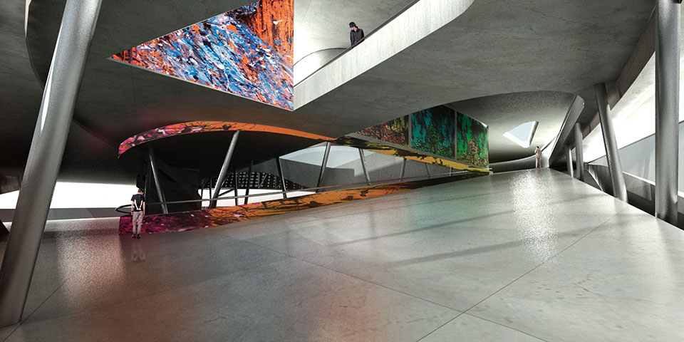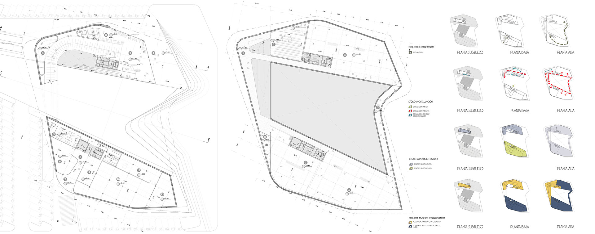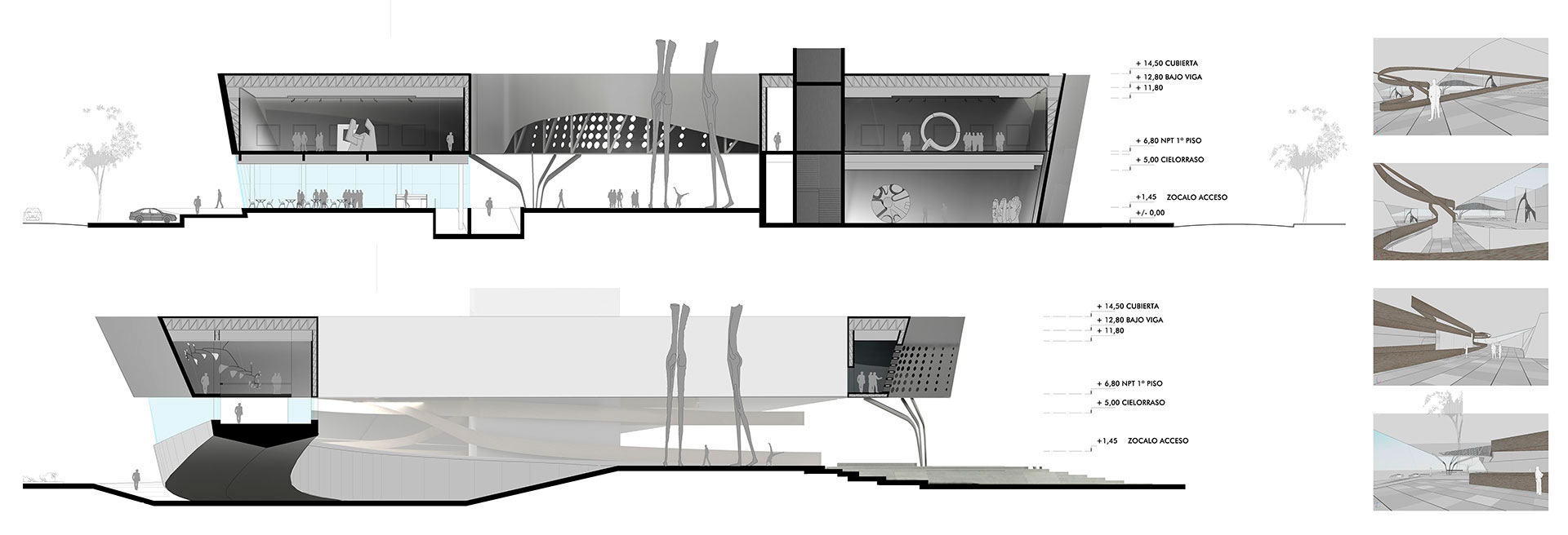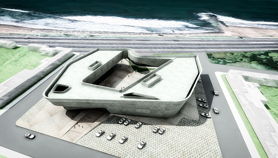 El museo se posa sobre un pasaje de esculturas accediendo por el ala norte, permeable entre la plaza de esculturas y el mar. En el ala sur, más compacta y hermética, se alberga el área museológica. En el nivel superior, las alas están conectadas formando un anillo de circulación.