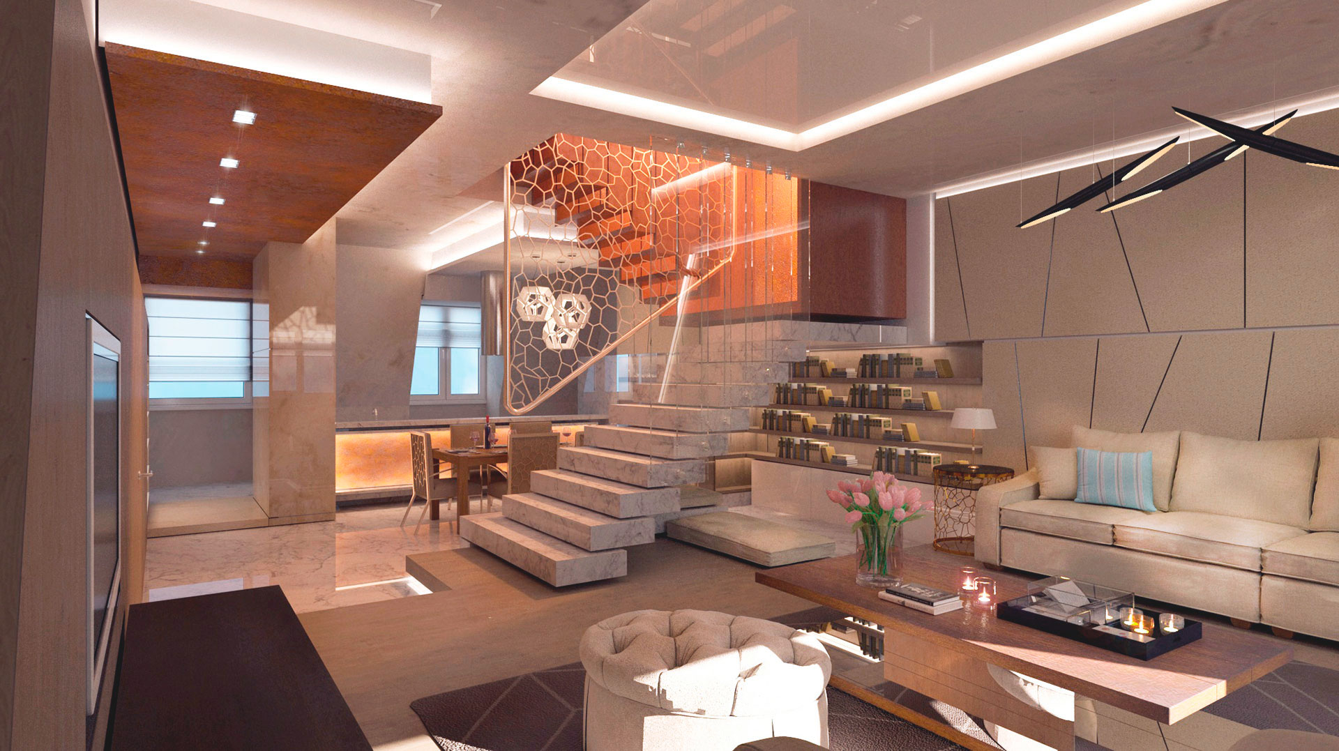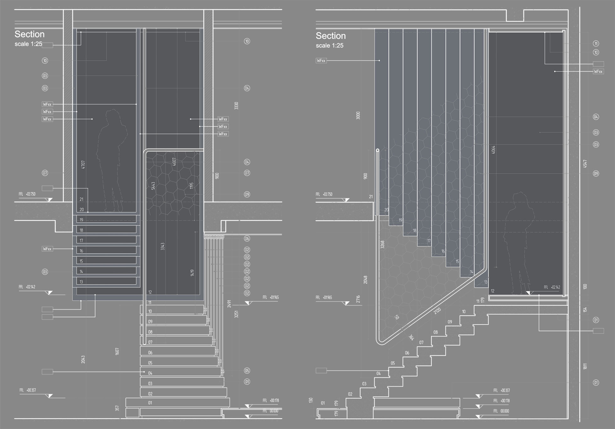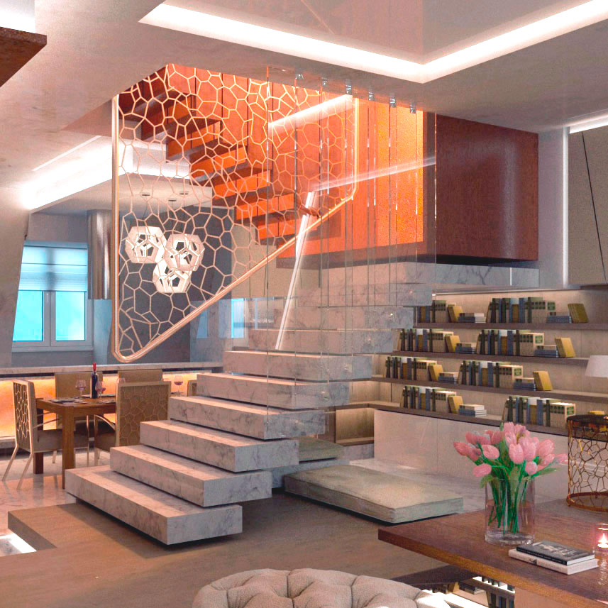 Dado que el proyecto tiene dos niveles la escalera ocupaba un lugar central y fue tratada como tal. Una pieza deconstruida en un nivel inferior que emerge del piso de tonos frios y material pesado y un nivel superior que se suspende desde la cubierta superior materializado en tonos calidos con escalones ahuecados que le dan mayor liviandad.