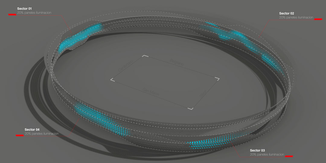 La propuesta se completa con la ampliación de la tribuna baja, anillo de palcos continuos entre tribuna MEDIA y tribuna ALTA y nuevas instalaciones gastronómicas.