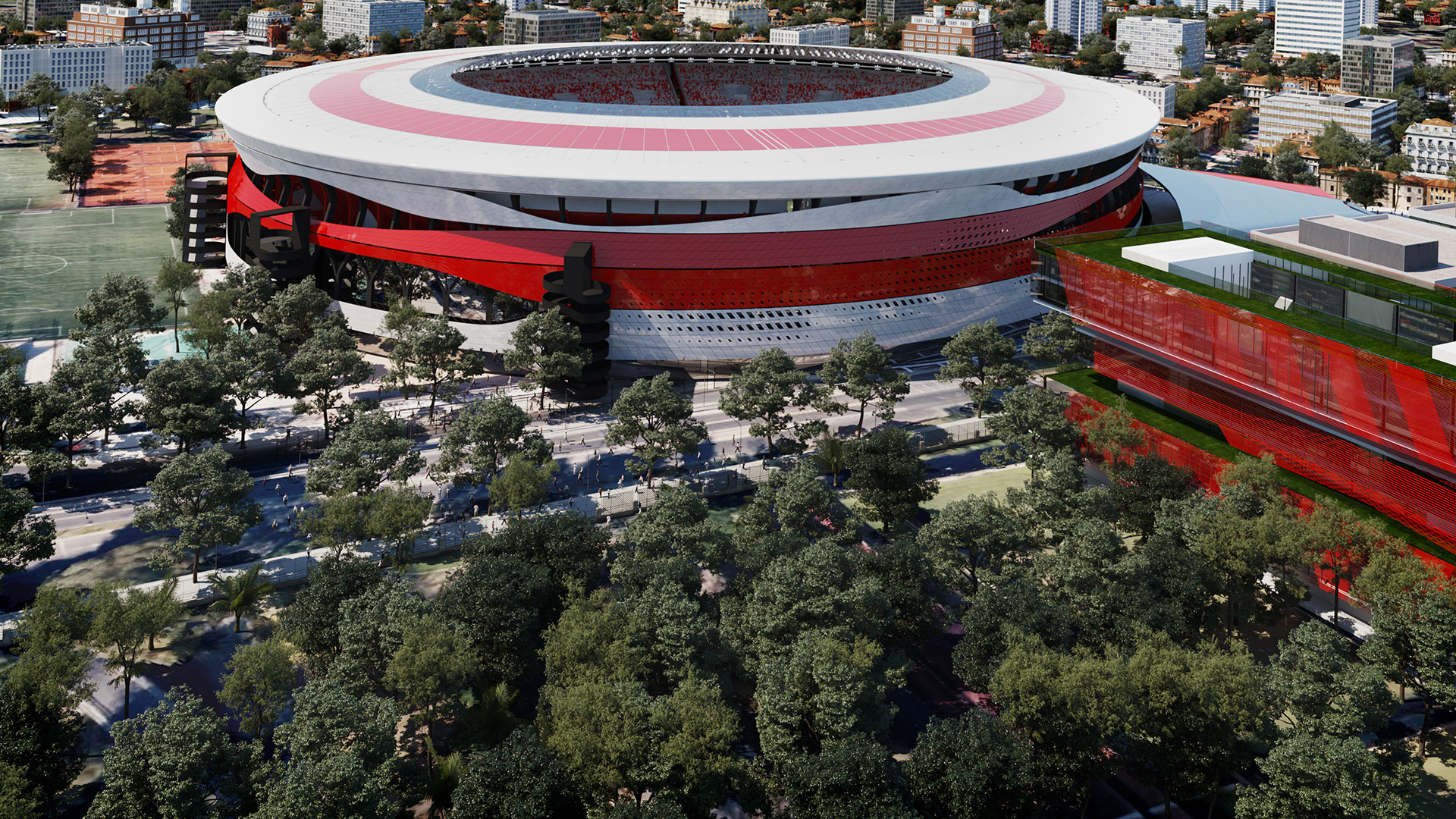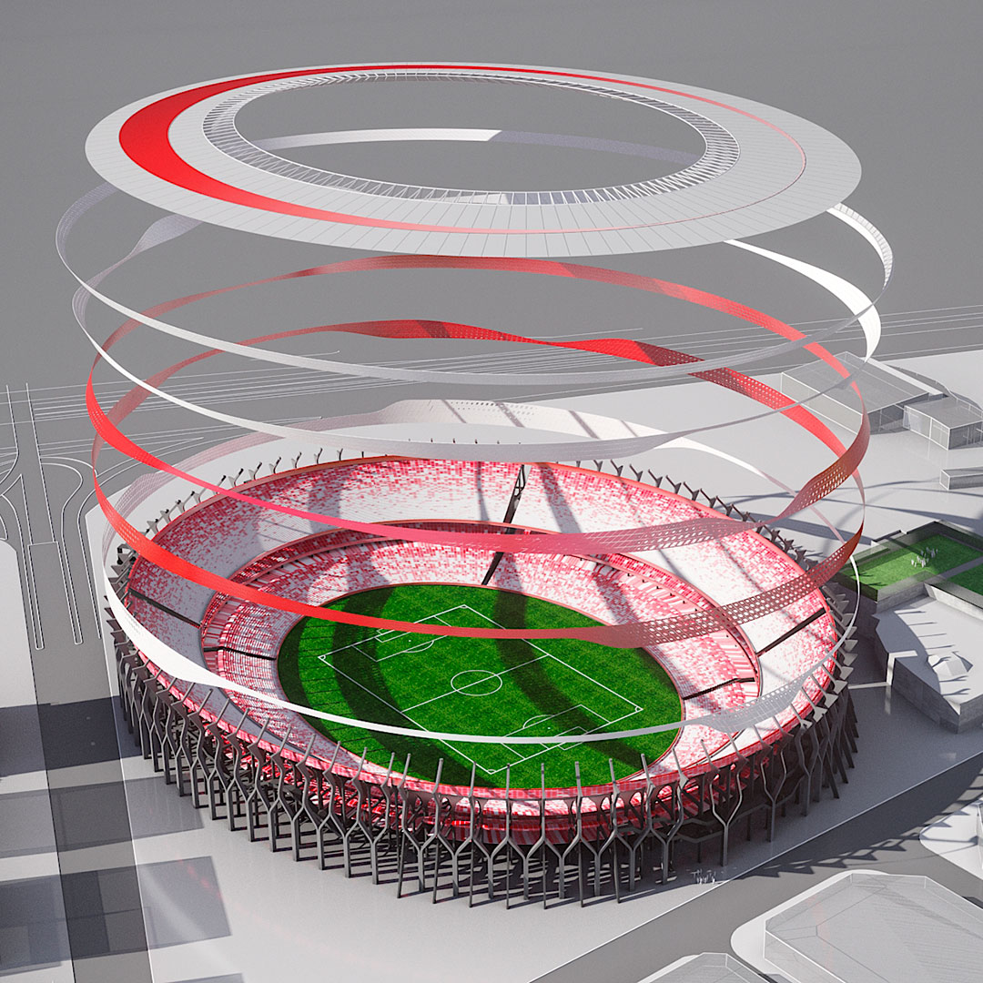 Una intervención integral que renueva la Identidad Riverplatense, potenciada con una propuesta educativa y polideportiva. Teniendo como pieza central al estadio el proyecto propone la incorporación de sectores de fachada ventilada manteniedo la estructura existente y los núcleos de circulación vertical. Capacidad ampliada de estacionamiento a 1000 plazas. Azotea para deportes recreativos.