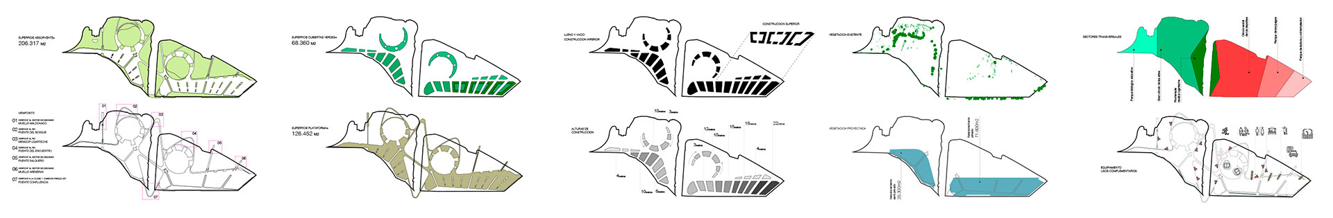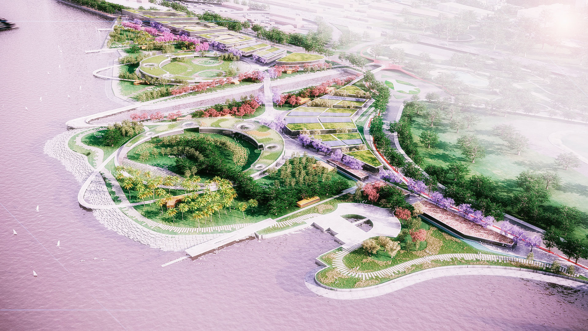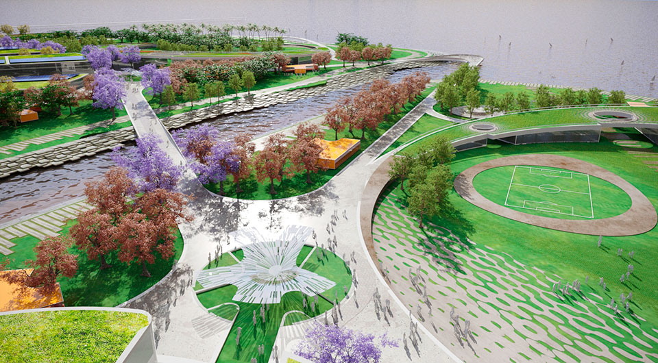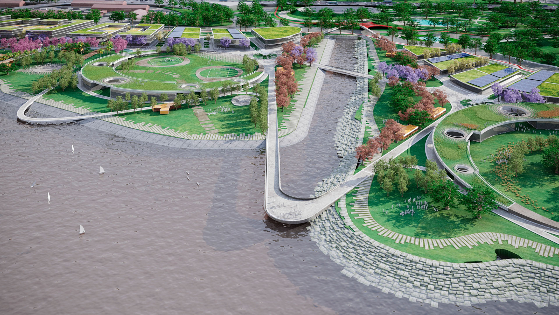 Como nexo específico entre la ciudad y el río se trabajó en el desarrollo de una figura conectora ubicada estratégicamente en el predio Parque KDT. Con su forma de doble triangulo concentra la articulación del proyecto sobre el canal Ugarteche. Figura de doble tensión CIUDAD-RIO actúa como costura entre ambos predios. Punto de encuentro y mirador a la ciudad como hacia el río, desde este artefacto articulamos espacios verdes, sociales y deportivos; y logramos acceder al predio entre sectores privados evitando pasar a su través.