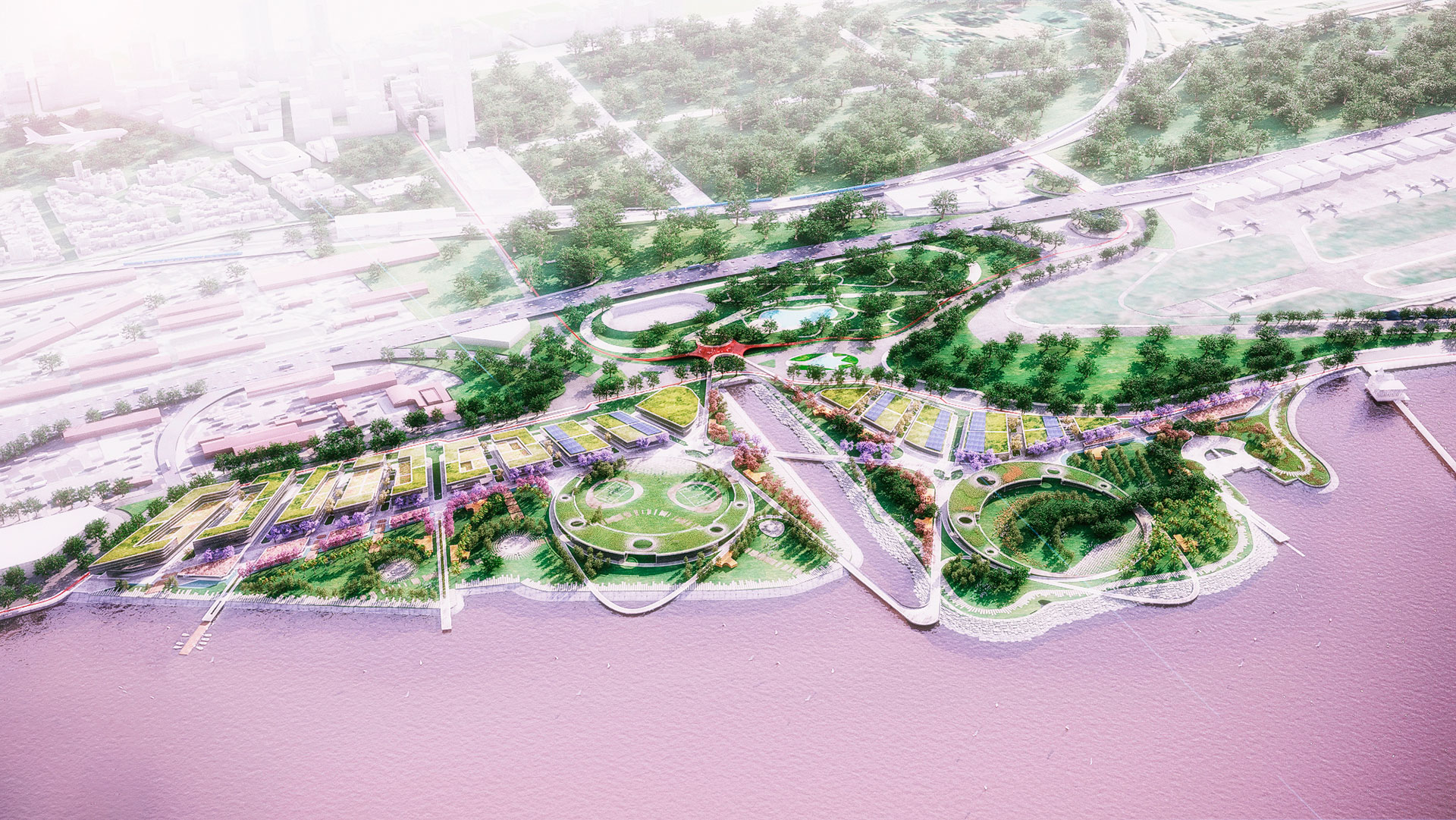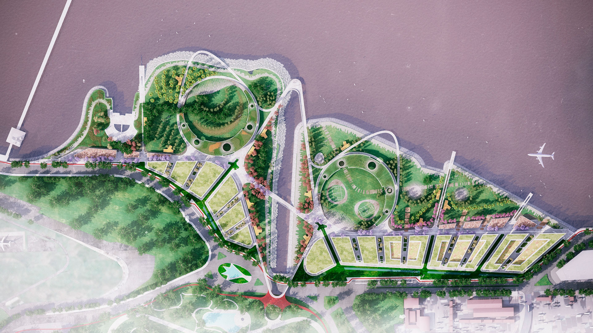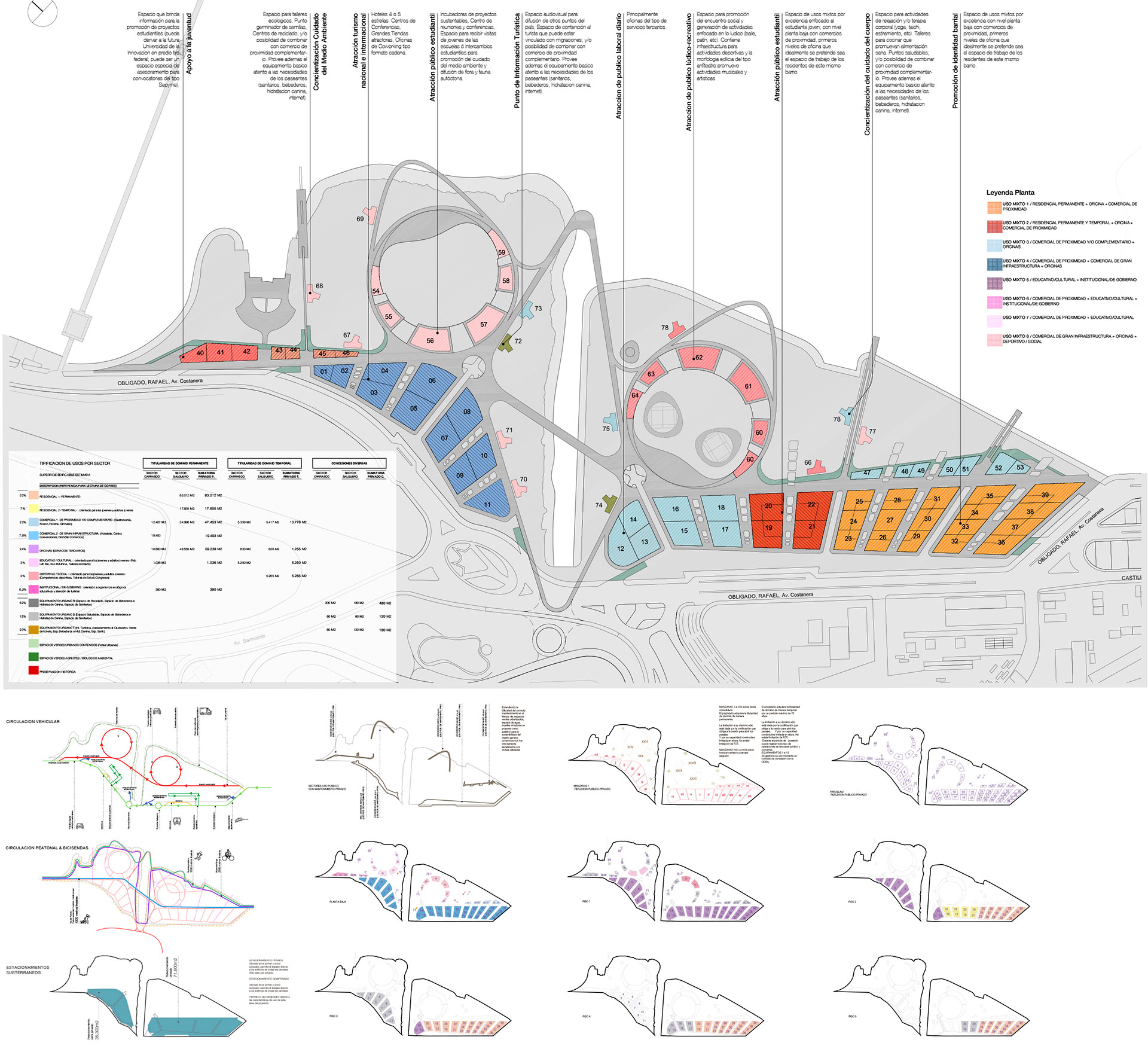 Como nexo específico entre la ciudad y el río se trabajó en el desarrollo de una figura conectora ubicada estratégicamente en el predio Parque KDT. Con su forma de doble triangulo concentra la articulación del proyecto sobre el canal Ugarteche. Figura de doble tensión CIUDAD-RIO actúa como costura entre ambos predios. Punto de encuentro y mirador a la ciudad como hacia el río, desde este artefacto articulamos espacios verdes, sociales y deportivos; y logramos acceder al predio entre sectores privados evitando pasar a su través.